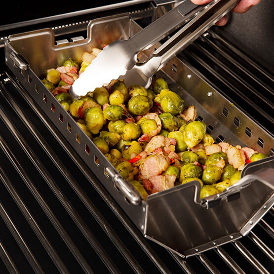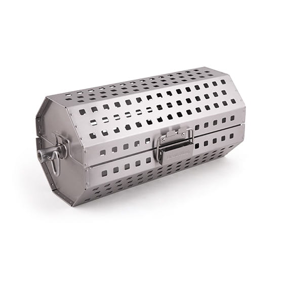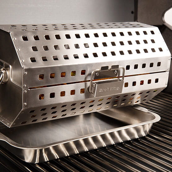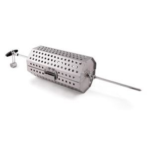 Kosz obrotowy do grillowania na rożnie obracanym silnikiem elektrycznym, wykonany jest ze stali szlachetnej. Idealnie sprawdzi się przy przygotowywaniu dań z drobiu oraz warzyw. Od kosza można odpiąć jego górną część i wykorzystać jako wok do grillowania. Kosz mieści się w grillu bez konieczności wyjmowania rusztów, a w grillach z 5 palnikami głównymi zmieszczą się dwa obok siebie. Wymiary: 40.6 cm x 15.2 cm x 15.2 cm Zestaw nie zawiera prętu do rożna"