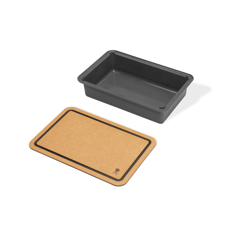 W serii Weber Works znajdziesz też inne akcesoria o zbliżonej funkcjonalności — ten pojemnik wyróżnia się uniwersalną deską do krojenia, która pracuje na obu stronach i zmienia rol w zależności od etapu przygotowania potrawy.