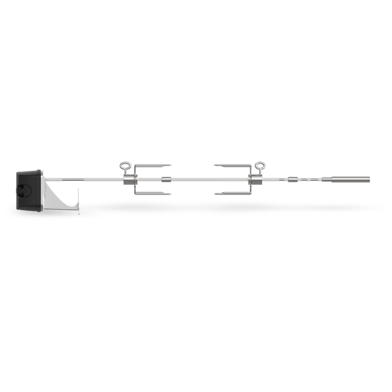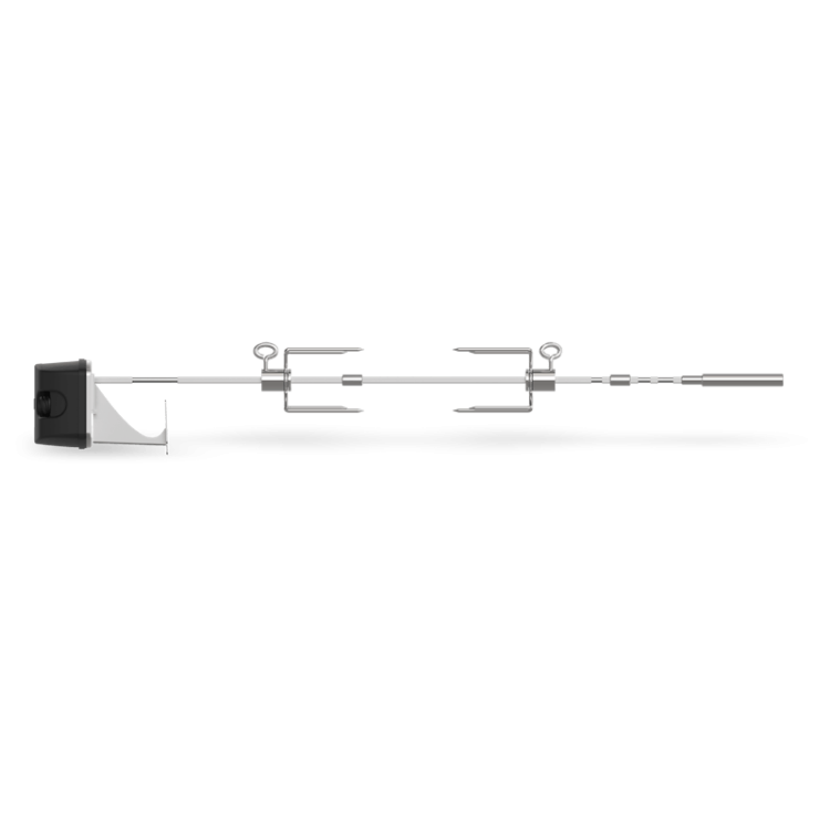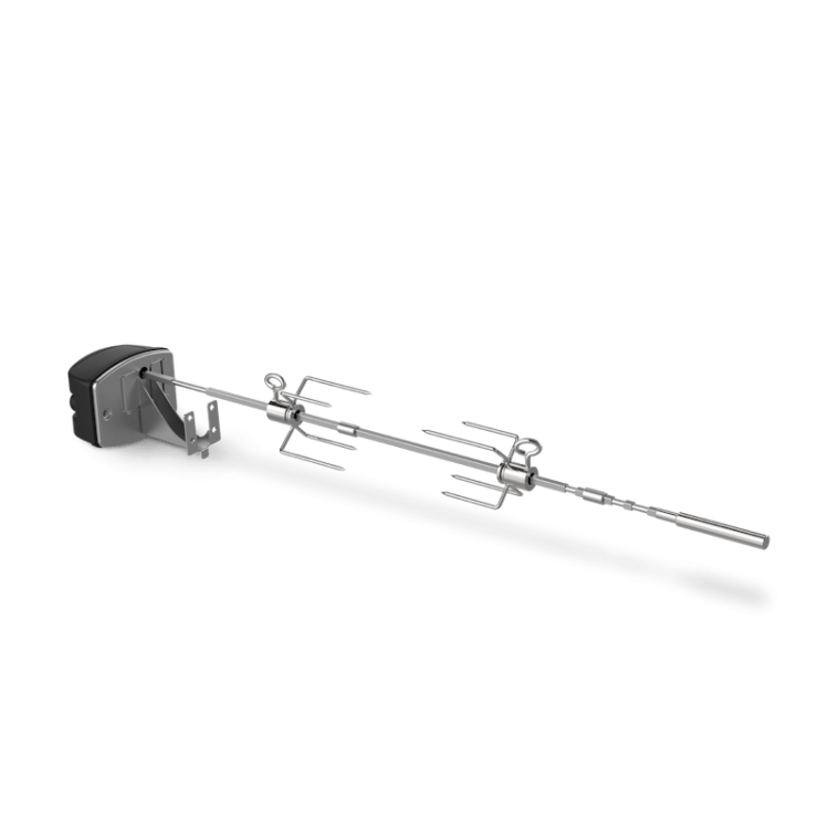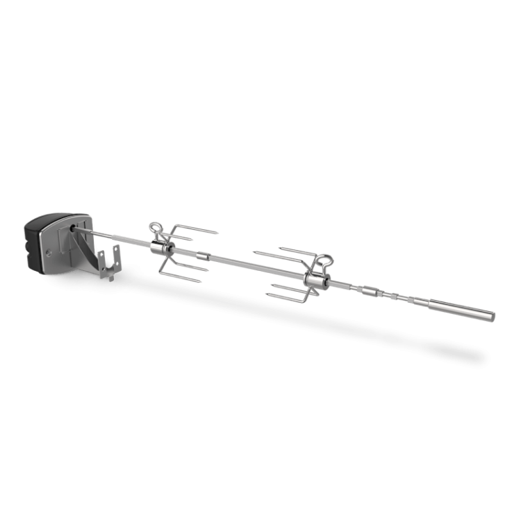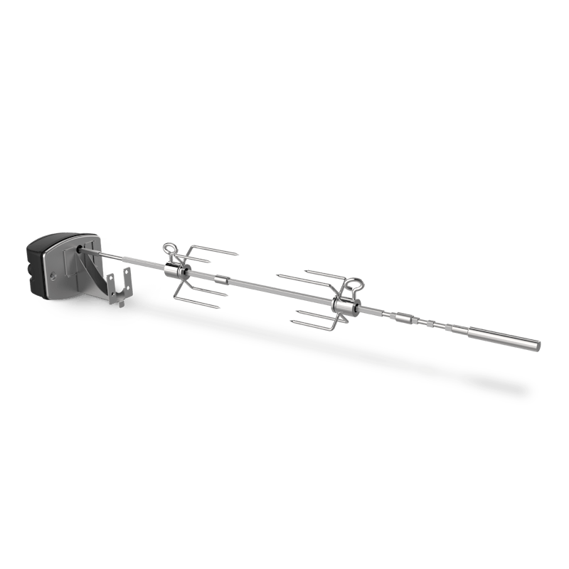 Elektryczny rożen ze stali nierdzewnej do grillów Weber Spirit® i Searwood®. Powolny obrót mięsa zapewnia równomierne pieczenie i naturalną glazurę. Idealny do całych drobiu i większych kawałków wieprzowiny — mięso pozostaje soczyte i aromatyczne.
