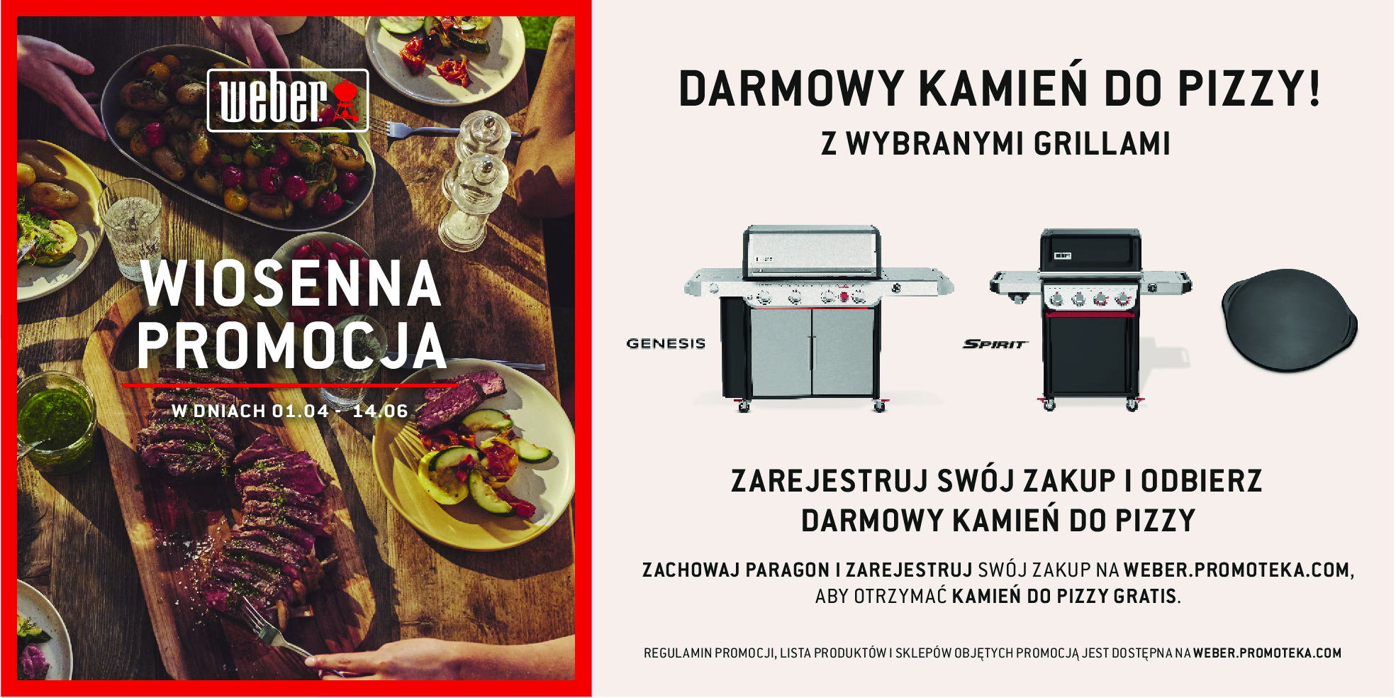 1. Promocja jest dostępna wyłącznie dla osób pełnoletnich, będących konsumentami (osoby fizyczne nieprowadzące działalności gospodarczej), zamieszkałych na terytorium Rzeczypospolitej Polskiej, które w okresie promocji zakupiły nowy grill z listy modeli wymienionych w punkcie 4. regulaminu, zarówno za pośrednictwem strony internetowej www.weber.com/PL, jak i u autoryzowanego sprzedawcy Weber. Zakupiony grill musi zostać zarejestrowany na koncie Weber ID www.weber.promoteka.com najpóźniej do dnia 30.06.2025 r. Rejestracja odbywa się poprzez stronę: www.weber.promoteka.com. Pracownicy organizatora oraz firm powiązanych (np. Weber-Stephen Polska sp. z o.o.) nie mogą uczestniczyć w promocji.